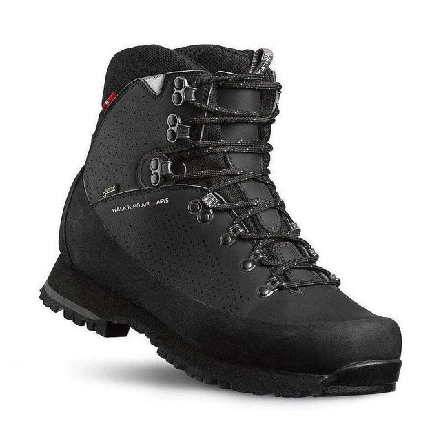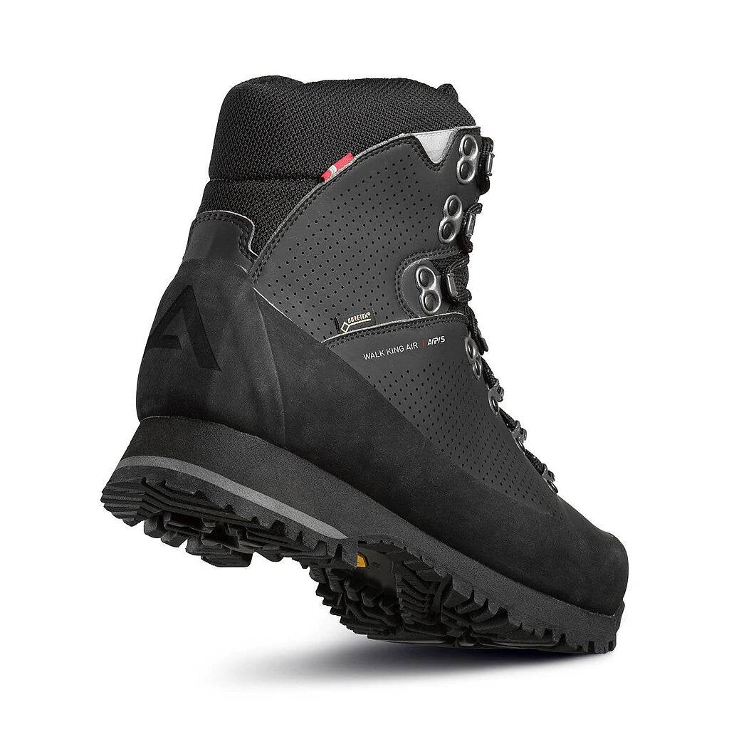 Mjuk överkant och Memoryfoam ökar komforten, medan gummiförstärkningen ökar hållbarheten. Dubbellåsningssystemet förenklar individuell anpassning. Den lätta EVA-mellansulan ger stabilitet och stötdämpning medan yttersulan Vibram® Grip AMG säkerställer gott grepp på både torra och våta ytor.Alfa Walk King Air är en känga i absolut toppklass - oslagbar komfort, grepp och kvalitet gör att kängan blir din bästa vän även på utmanande turer.