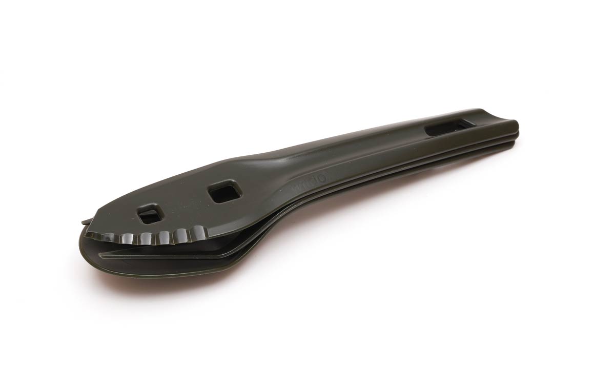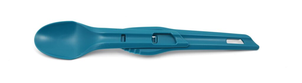 Kniven och skeden kan kopplas samman till en lång sked. Praktiskt när man skall ner i påse med frystorkad mat eller djupare grytor.