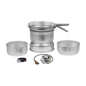 Detta är Trangias större kök, perfekt för 3-4 personer. Köket innehåller två kittlar i storleken 1.75 l respektive 1.5 liter, en stekpanna, ett vindskydd (övre och nedre del), gasolbrännare, handtag och rem.